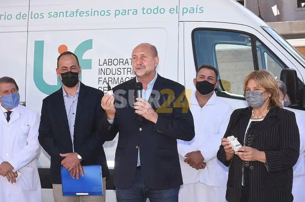 El gobernador Omar Perotti junto a la ministra de Salud de Santa Fe, Sonia Martorano, en la presentación del producto – Foto: Flavio Raina