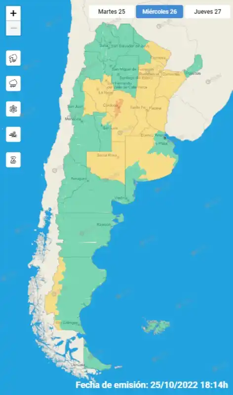 El Servicio Meteorológico Nacional renovó en su última actualización el alerta nivel amarillo por tormentas para la madrugada de este miércoles 26, sumándose además una advertencia por vientos para la tarde de mañana.