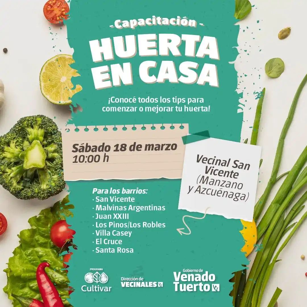 La Dirección de Vecinales y el programa Cultivar inician este sábado la primera de las capacitaciones abiertas y gratuitas de “Huerta en Casa”, una iniciativa que acercará algunos tips a los vecinos y vecinas que quieren comenzar una huerta domiciliaria o mejorarla.