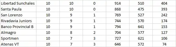 Tabla: Santa Paula de Gálvez 4, Sportsmen Unidos de Rosario 3 y Sport Club Cañadense 2