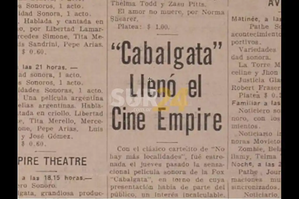 “Con el clásico cartelito de “no hay más localidades”, fue estrenada el jueves pasado la sensacional película sonora de la Fox ‘Cabalgata’, en torno a cuya presentación había de parte del público un interés incalculable”, dice la pieza periodística.