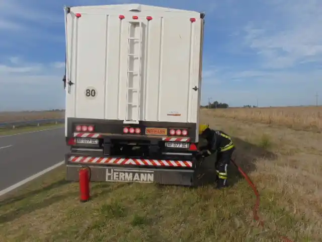 El incidente ocurrió este viernes, a las 17.05, en zona rural (camino a San Eduardo) donde camión Mercedes Benz con acoplado cargado de soja, tripulado por Roberto de 40 años, tomó fuego en el sistema de frenos de las cubiertas traseras del lado derecho del acoplado.
