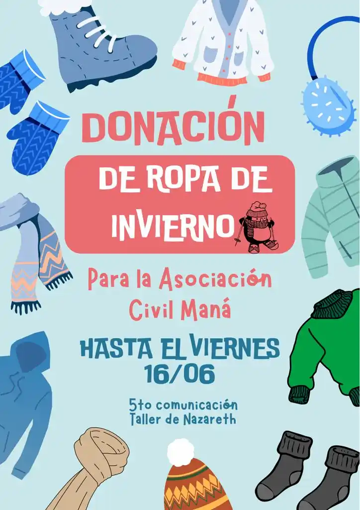 Alumnos de 5º año de la modalidad Comunicación de la Escuela de Enseñanza Media Particular Incorporada Nº 2065 “Taller de Nazareth”, están realizando una campaña solidaria para ayudar a la Asociación Civil Maná y a las familias del barrio Esfuerzo Propio. El objetivo es recolectar ropa de abrigo usada, limpia y en buen estado, para ser distribuidas entre los vecinos más necesitados.