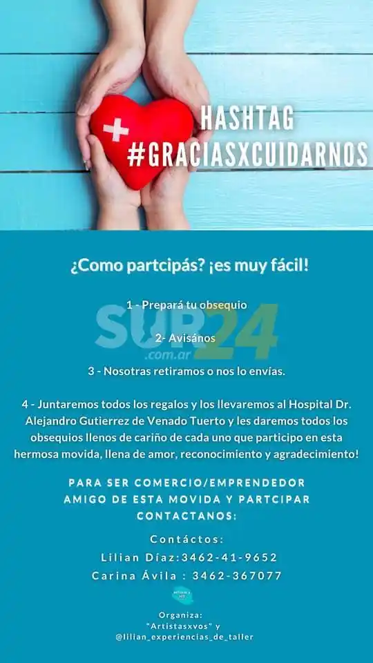 “Gracias por Cuidarnos” es una movida solidaria surgida desde “ArtistasXVos” y llevada adelante por Carina Ávila y Lilian Díaz quienes buscan recolectar 300 presentes para el personal de salud abocado al sector Covid del Hospital.