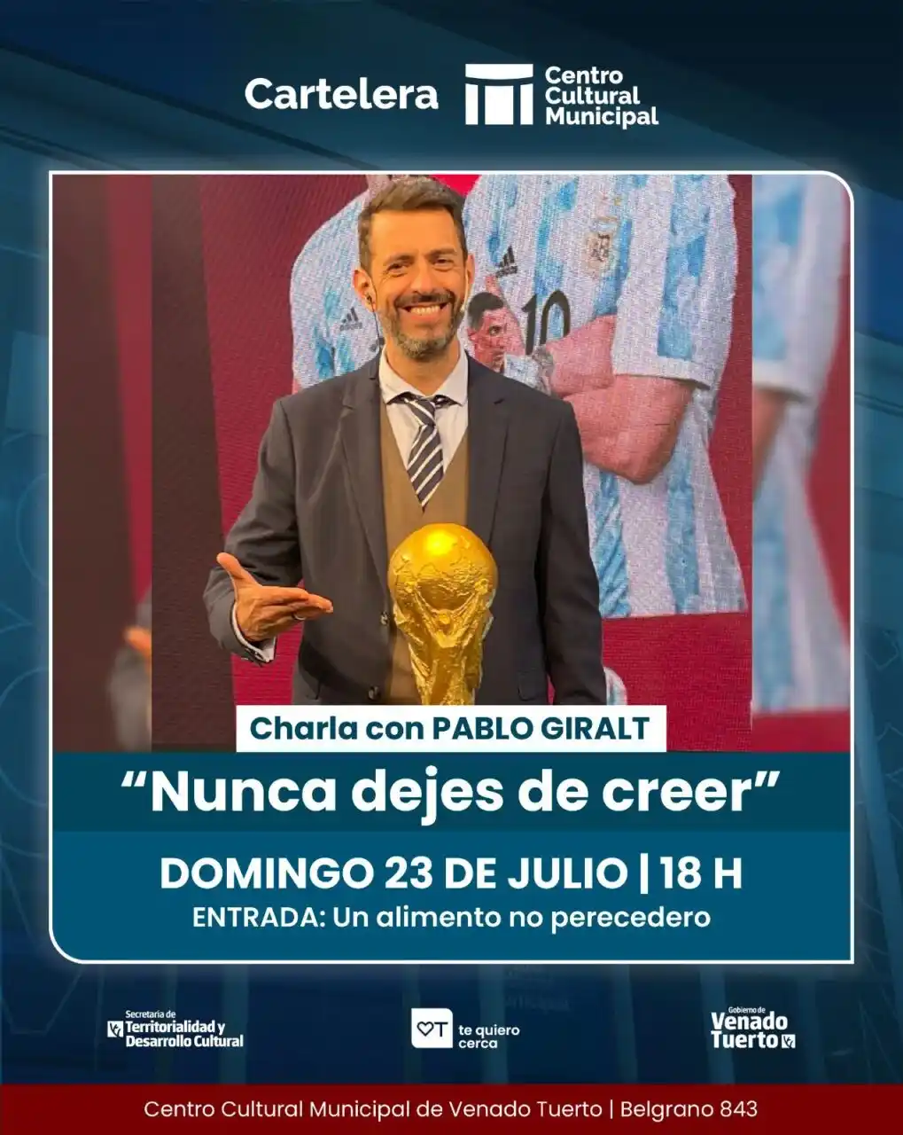 Un par de semanas atrás, en sesión semanal de los miércoles, a instancias de una iniciativa del bloque oficialista Primero Venado, el Concejo de Venado Tuerto había declarado de Interés Municipal la obtención del premio “Martín Fierro” por parte de Pablo Giralt, en virtud de la conducción del programa televisivo “Somos Mundiales”, emitido por la TV Pública durante la Copa Mundial de la FIFA Qatar 2022 y, además, reconoció la extensa labor y valiosa trayectoria del relator.