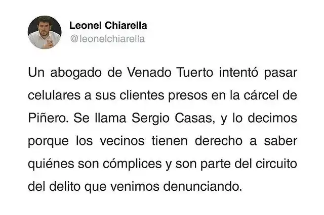 Leonel Chiarella hizo una publicación en redes sociales en donde sostiene que “un abogado de Venado Tuerto intentó pasar celulares a sus clientes presos en la cárcel de Piñero. Se llama Sergio Casas, y lo decimos porque los vecinos tienen derecho a saber quiénes son cómplices y son parte del circuito del delito que venimos denunciando”.
