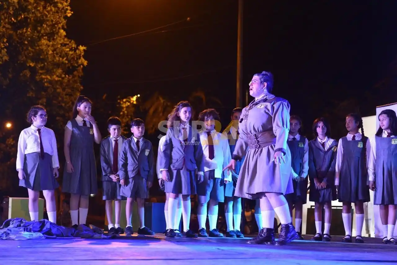 La Escuela Municipal de Teatro Musical (EMTM) cerró su ciclo anual este domingo con un doble espectáculo en Sarmiento y Juan B. Justo, donde se montó un imponente escenario para presentar “Las Risas del Rock” y “Matilda”, ante un público numeroso que premió con sostenidos aplausos ambas propuestas.