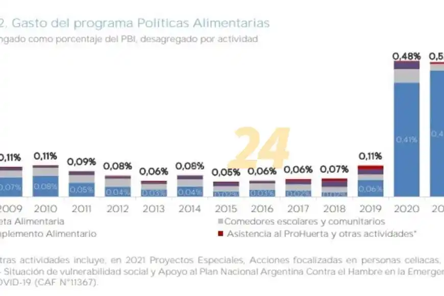 En 2020 -por efectos de la pandemia- esa cuenta trepó al 0,48% del PBI, pero lejos de resignar ayudas por la recuperación económica, la cifra de esas ayudas alcanzó hasta el 0,52%.