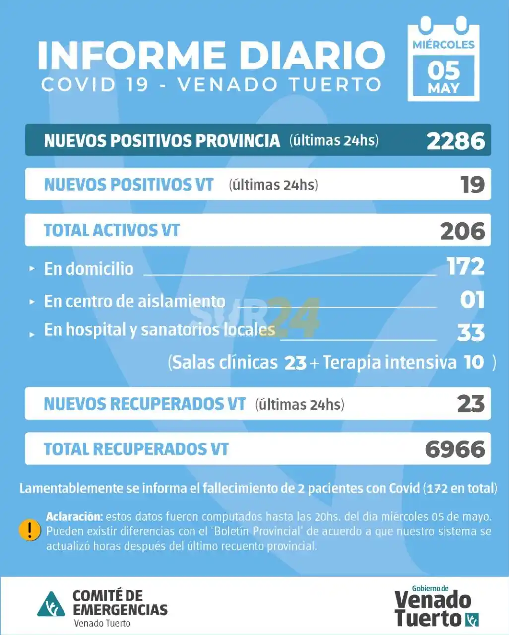 [vc_row][vc_column][vc_column_text]Como viene ocurriendo esta semana, desde el lunes hasta hoy el informe epidemiológico local comunica la muerte de pacientes a causa del coronavirus; el lunes se informaron dos, ayer uno y hoy 5 de mayo nuevamente confirman dos decesos, elevando a 172 las víctimas por el virus.
