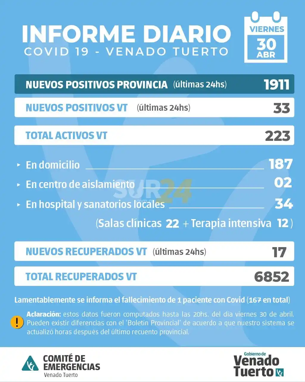 [vc_row][vc_column][vc_column_text]En el cierre de la semana, el número de casos vuelve a subir respecto a la jornada anterior, como viene sucediendo estos últimos días. Ayer jueves se informaron 15 positivos, mientras que hoy se detectaron 33, dejando de esta forma la cantidad de casos activos en 223. En cuanto a la ocupación de camas se mantiene con 34 internados, uno menos que ayer. Y nuevamente informan un fallecimiento, elevando a 167 el total de muertes relacionadas al virus.