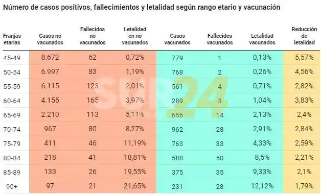 En el rango etario de 65-69 años, el 5,1% de los no vacunados que se contagiaron (2.210 casos) fallecieron, mientras que la letalidad bajó al 2,1% de la población contagiada que había recibido la vacuna (656 casos). Y en lo más alto de la pirámide etaria (personas de más 90 años), la letalidad en los no vacunados fue muy elevada (21.6%); pero descendió a un 12,1% en estos adultos de edad muy avanzada que sí se vacunaron.