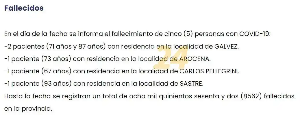 Ya que por el momento se cuenta con el reporte de la provincia para conocer el día a día de los casos Covid reportados porque, al menos en la región, algunas localidades dejaron de confeccionar su informe por baja de contagios o directamente porque no presentan enfermos por el virus, este martes 5 de octubre, los 39 positivos fueron: Rosario (6), Santa Fe (5), Coronda (3), Villa Ocampo (2), Cañada de Gómez (2), San Jorge (2), Tostado (1), Armstrong (1), Frontera (1), Villa Constitución (1), Cayastá (1), Helvecia (1), Rufino (1), Arroyo Ceibal (1), Puerto Reconquista (1), Correa (1), Totoras (1), Esperanza (1), Funes (1), Villa Gobernador Gálvez (1), San Guillermo (1), Arocena (1), La Criolla (1) y Calchaquí (1).