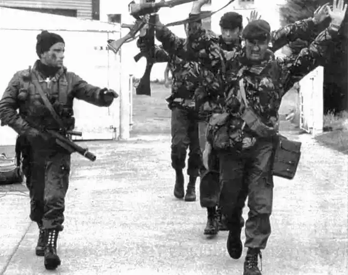 La rendición. El cabo Carlos Cequeira, de 27 años, reúne a los Royal Marines que defendían la casa del gobernador en Puerto Stanley / crédito gentileza