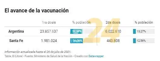 Si se ponen en contexto estos datos, cabe hablar de la inoculación global en términos porcentuales en la provincia y el país. De acuerdo al Monitor Público de Vacunación de Nación, en Santa Fe el 56,05% de la población recibió una dosis, y el 12,56% las dos; en la Argentina, (con casi 24 millones de dosis aplicadas), el 52,58% de la población total tiene una vacuna colocada, y el 13,27% el esquema completo de dos dosis (ver Ranking de países).