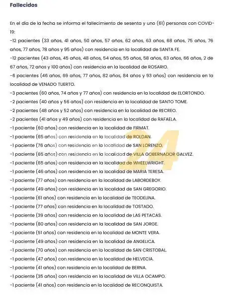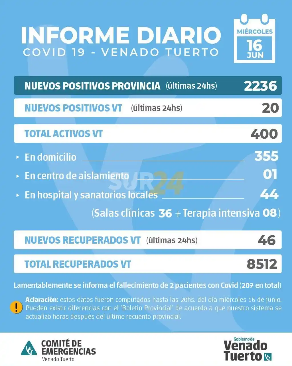 El dato negativo de la fecha es la muerte de dos venadenses, sumando un total de 207 los vecinos que perdieron la vida con Covid-19. Cabe destacar que la Provincia, en su informe de hoy, indicó que fallecieron seis personas en Venado, que suele suceder cuando se acumulan datos de días anteriores por diferencia en la carga.