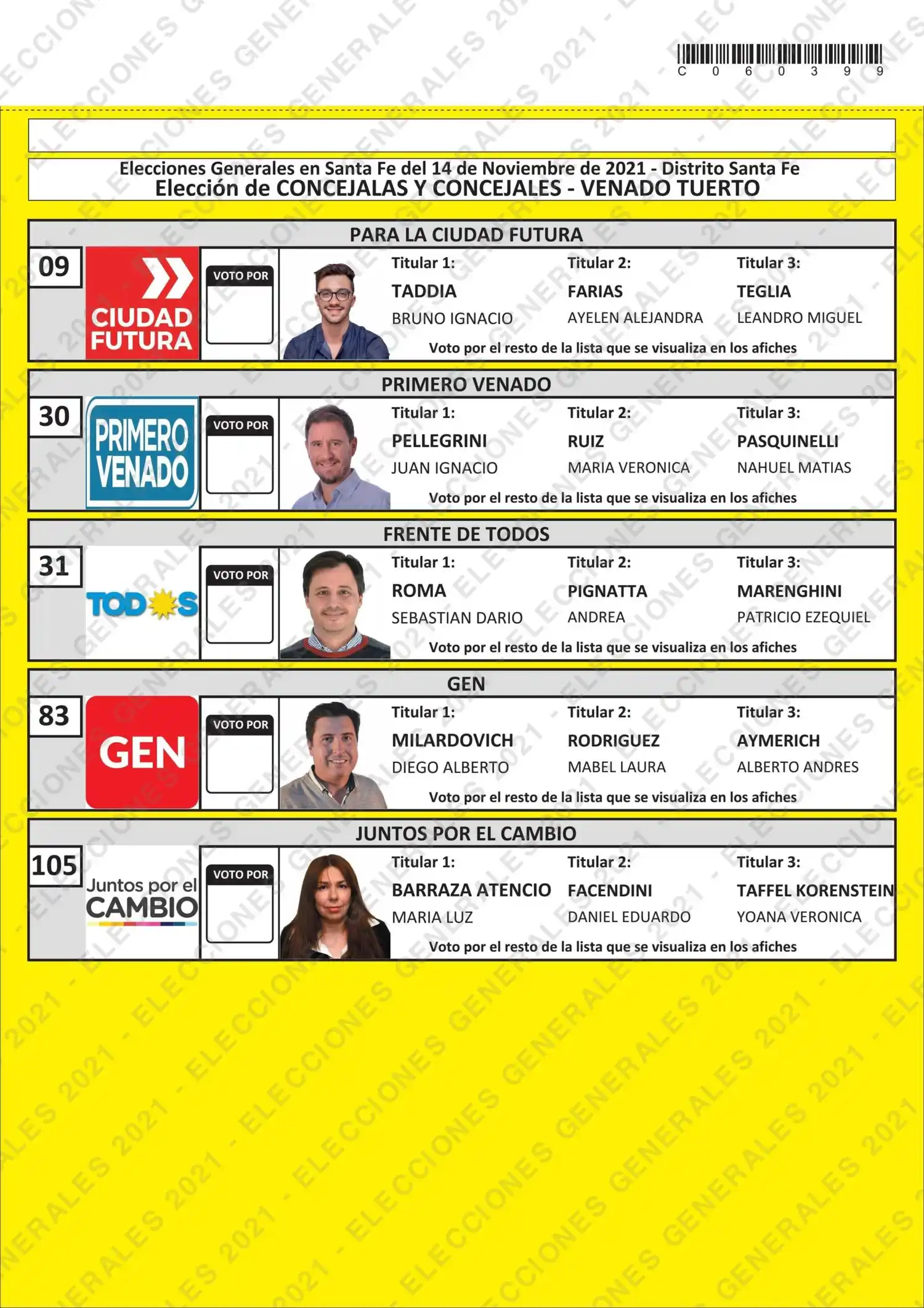 En primer lugar, aparece quien obtuvo el segundo puesto y dio el “batacazo” en las PASO, como candidato único, el referente de Ciudad Futura Bruno Taddia. Luego se ubica el candidato oficialista de Primero Venado, Juan Ignacio Pellegrini que obtuvo el mayor porcentaje en las primarias.
