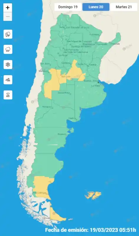 A su vez durante la tarde de este sábado se emitió otro alerta para esta región pero por tormentas para la noche del día lunes y que en la última actualización aún persiste.