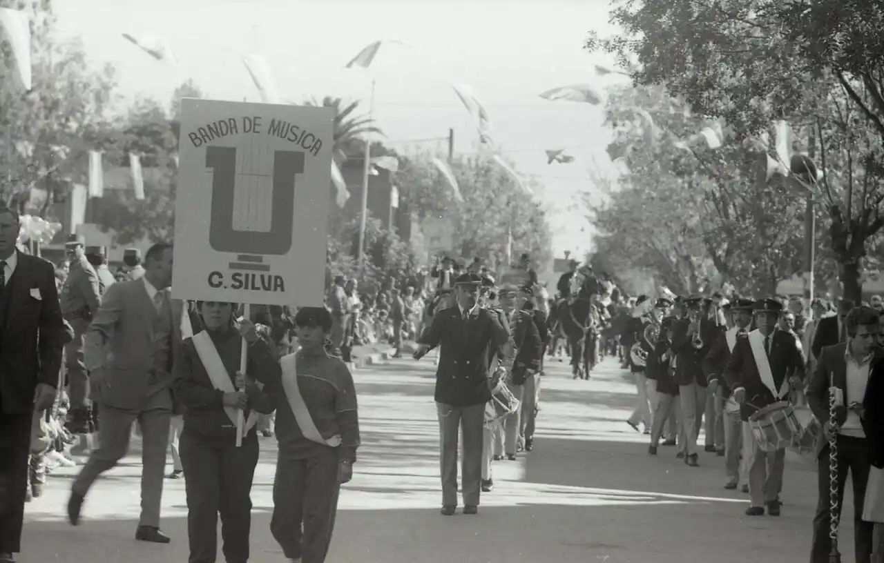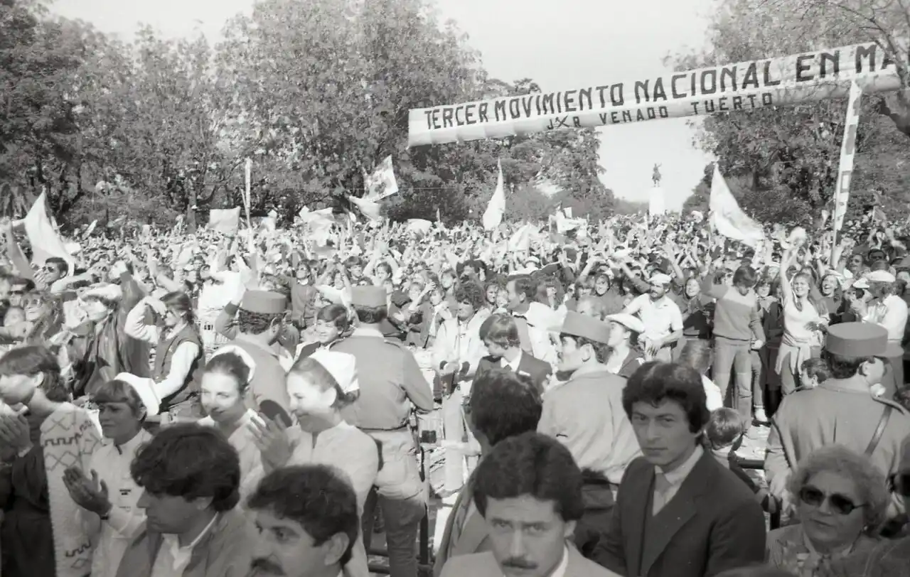 Otra foto que integra la muestra sobre la visita de Alfonsín es la del desfile de instituciones saludando a su paso a las autoridades. (Foto: Archivo Histórico Digital de Venado Tuerto)