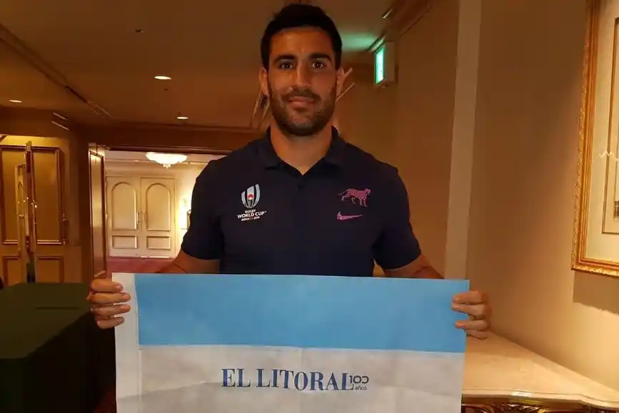 Jerónimo de la Fuente, uno de los referentes de Los Pumas, en 2019, con la bandera de EL. Crédito: El Litoral.