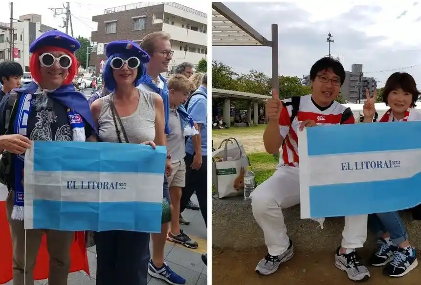 La bandera de El Litoral, en manos de hinchas franceses y japoneses. Fue en el marco del mundial 2019. Crédito: El Litoral.