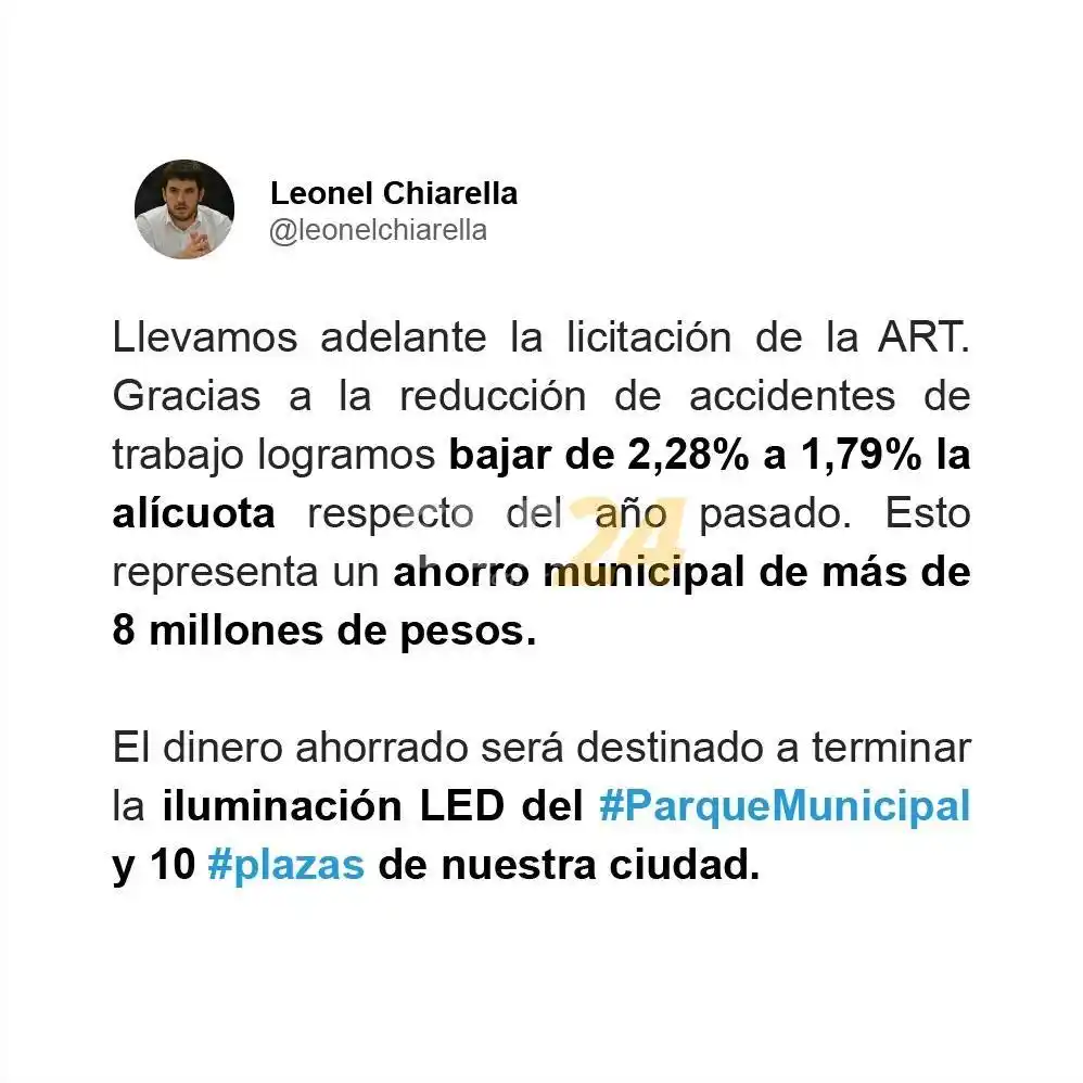 El intendente Leonel Chiarella informó una nueva acción de ahorro y transparencia del Gobierno de la ciudad. Esta medida administrativa posibilitará generar fondos para la terminación de la iluminación LED en el Parque Municipal y renovar las luminarias de otras 10 plazas de distintos barrios.