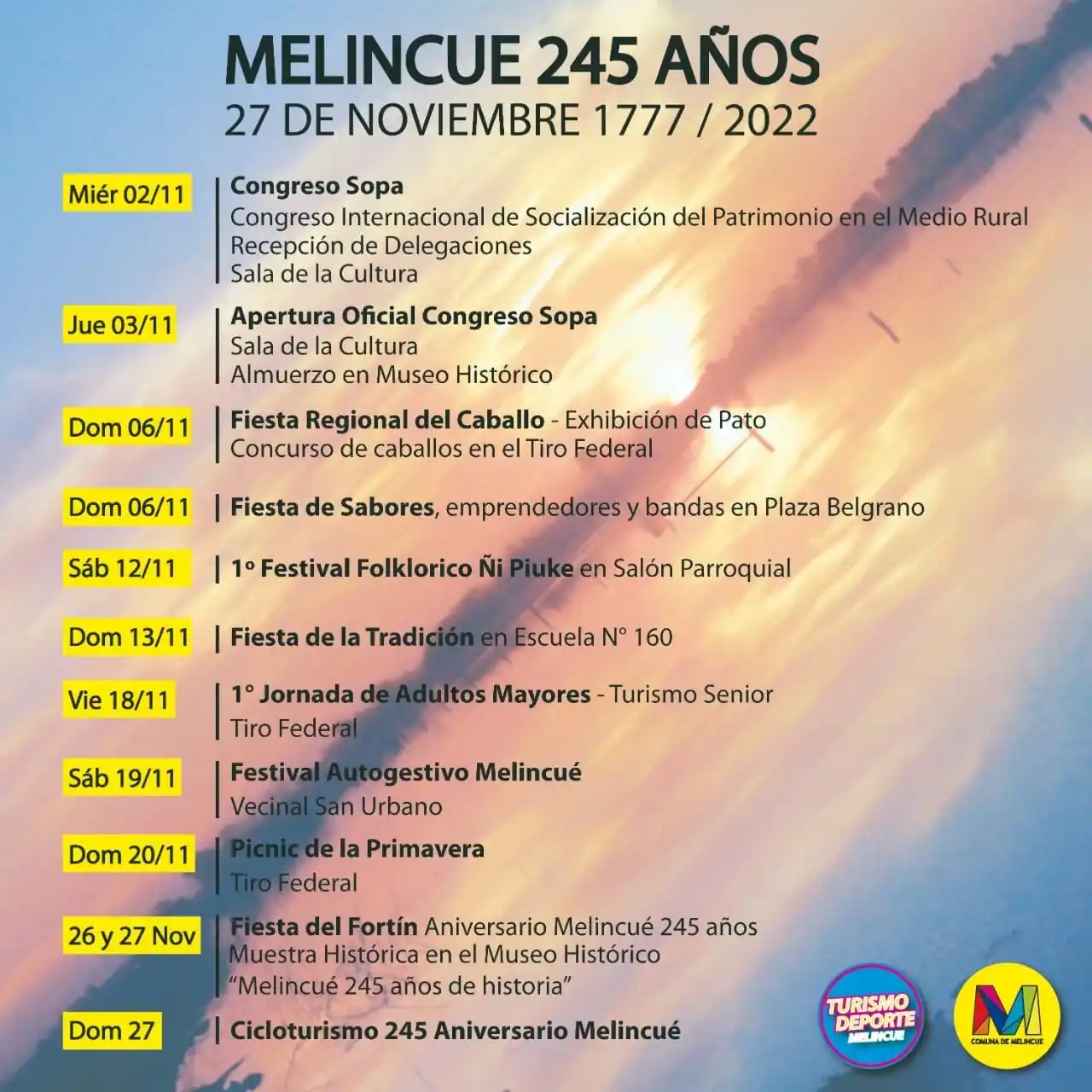 Durante noviembre, la localidad estará realizando diferentes actividades culturales y para toda la familia, enmarcadas en el 245º aniversario de Melincué.