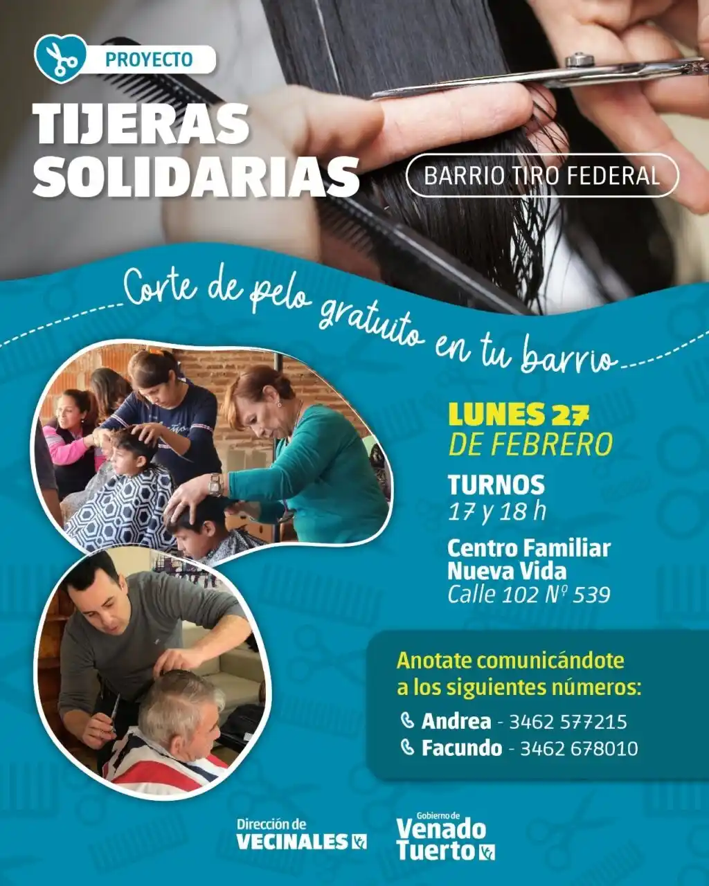 Vuelve el proyecto “Tijeras Solidarias” en su edición 2023, con una propuesta de corte de pelo gratuito para el barrio Tiro Federal este lunes 27 de marzo en el Centro Familiar Nueva Vida, calle 102 539.