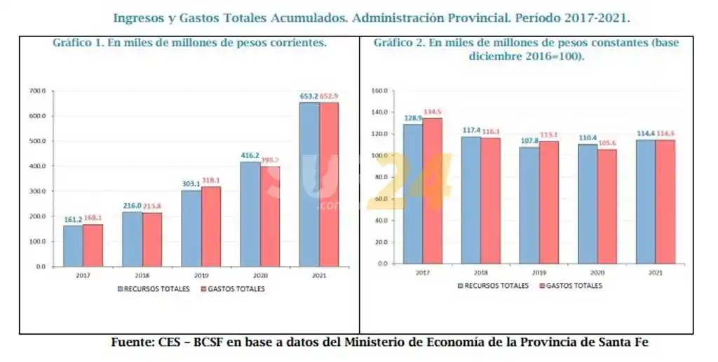 El Centro de Estudios y Servicios de la Bolsa de Comercio de Santa Fe señala sin embargo que “a diciembre de 2021 los ingresos totales acumulados del año ($ 653.214,2 millones) fueron mayores que los gastos totales ($ 652.919,2 millones). De esta manera, el año cerró con un superávit por $ 295,0 millones.