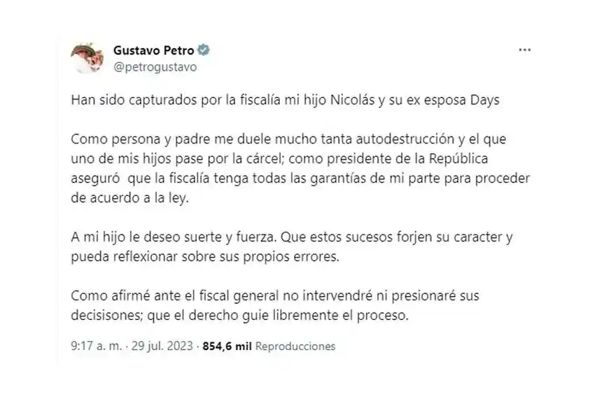 “La Fiscalía General de la Nación se permite informar que el día de hoy sobre las 6 (8 de Argentina), en cumplimiento a lo dispuesto por el Juzgado 16 Penal Municipal con Función de Control de Garantías de Bogotá, se hizo efectiva la orden de captura proferida contra Nicolás Fernando Petro Burgos, por los delitos de lavado de activos y enriquecimiento ilícito”, informó el ente judicial en un comunicado subido a redes sociales.
