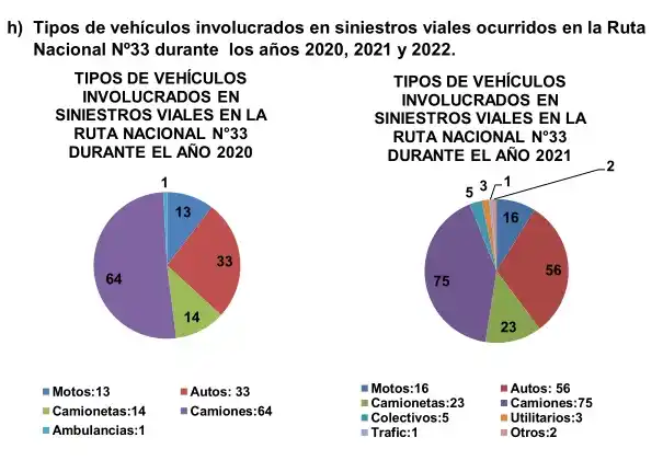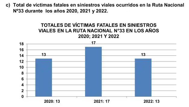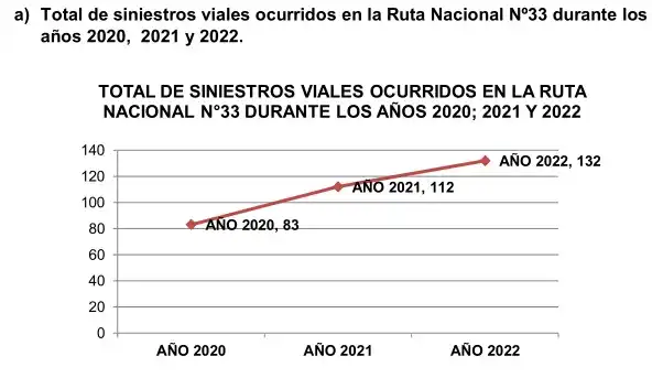 El total de víctimas fatales en los siniestros viales -detallan- sucedidos en la Ruta Nacional N°33 durante el año 2022, con respecto al año 2021, demuestra una disminución sustancial del 25% en el año 2022.