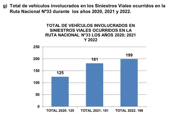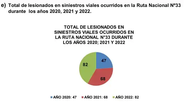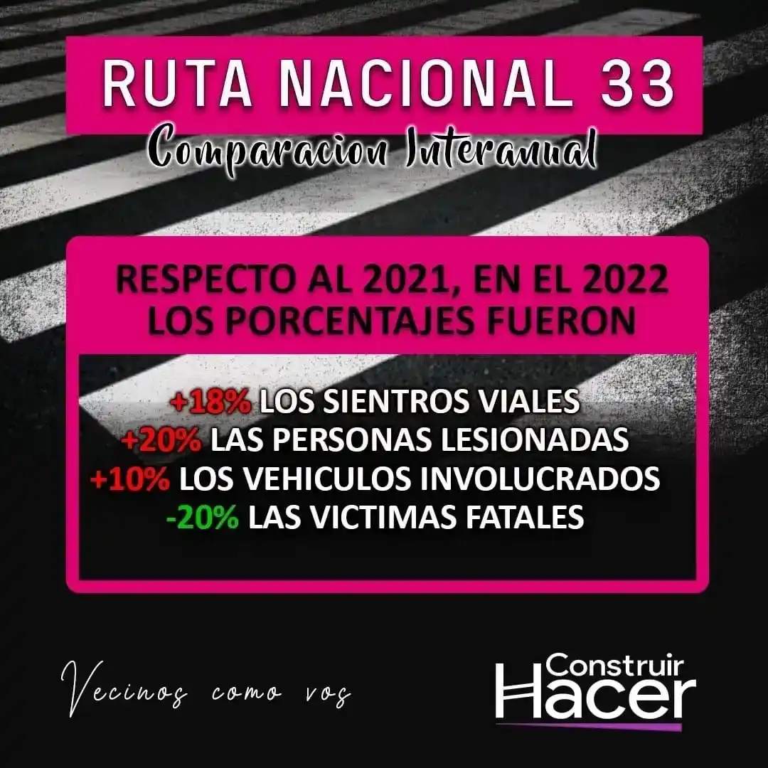 El total de los siniestros viales ocurridos en la Ruta Nacional N°33 durante el año 2022 con respecto al año 2021, demuestra un incremento mayor al 18 % durante y con el año 2020 aumentaron en un 60 % de los siniestros viales, detalla Construir Hacer.
