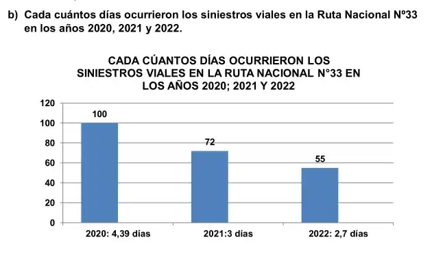 Se demuestra que en el año 2022, el tiempo en que se produjo un siniestro vial en la Ruta Nacional N°33 es cada 55 hs, mientras en el año 2021 había sido cada 72 hs, lo que significa una reducción de 17 hs entre el 2022 y 2021, mientras en el año 2020 había sido un Siniestro Vial cada 100 hs, la diferencia fue de 45 hs.