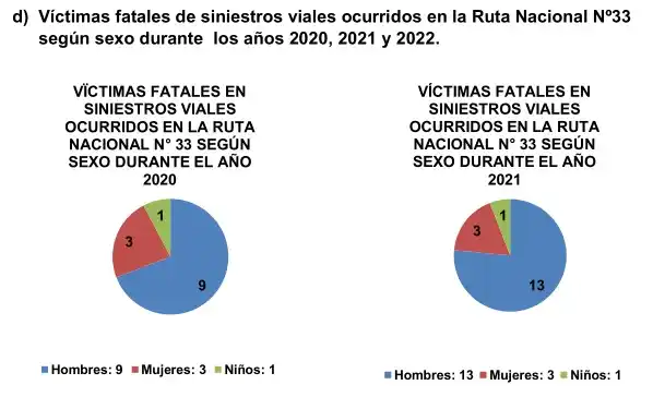 En referencia a las víctimas fatales tanto en el año 2022, como en el año 2021 y el año 2020 el sexo masculino, es quien más se ve afectado en los siniestros viales de la Ruta Nacional N°33, siendo un 69 % en el año 2022, en el año 2021 un 76,50 % del total de las víctimas fatales y en el año 2020 fue de un 69 %.