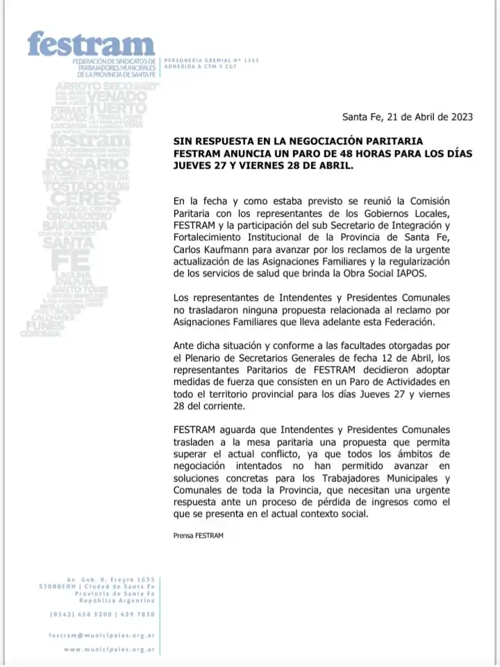 En este marco y ante “la falta de respuesta en relación con los reclamos que lleva adelante esta Federación, los representantes paritarios de Festram decidieron adoptar medidas de fuerza que consisten en un paro de actividades en todo el territorio provincial para los días jueves 27 y viernes 28 de abril”, comunicaron los municipales.