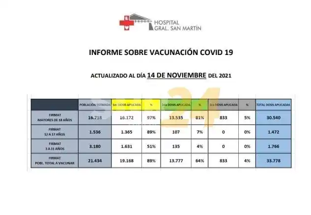 Desde el Hospital “General San Martín” de Firmat informaron que en total ya se aplicaron 33.778 dosis de la vacuna contra el Covid-19, de las cuales 16.172 fueron de primera dosis para mayores de 18 años (97%), 13.535 se aplicaron ambas dosis en ese rango etario (81%) y 833 (5%) el refuerzo que llegó para mayores de 50 que recibieron Sinopharm.