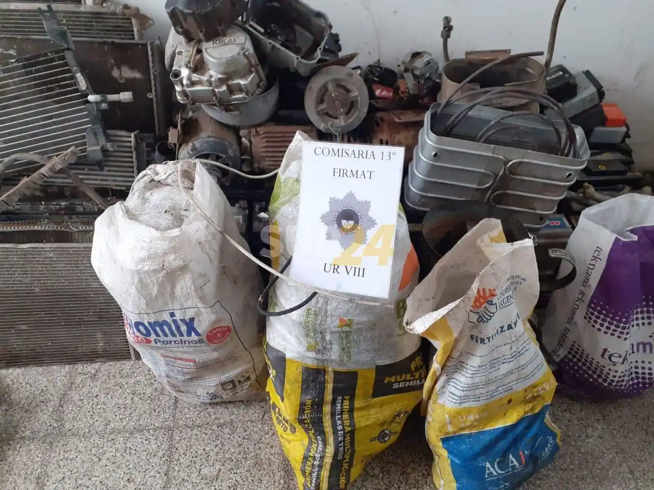El material secuestrado está constituido por 17 radiadores, 26 bochas, 36 baterías gandes, 8 baterías chicas, 4 motores-2 a la mitad, 1 carcasa reflector, 3 tapas de cilindro de moto, 1 tapa de motor, 1 calefón, 1 carcasa, 1 aire acondicionado, 1 bocha y radiador, 2 tapa de cilindro, 1 carcasa máquina de cortar pasto, 1 carter, 14 kilos de bronce, 1 jarrón de bronce con manija y relieve, 1 mesita de bronce con 4 patas desarmada, 42 kilos de cobre, 12 kilos de cable de aluminio, 3 kilos aluminio, dos teléfonos celulares ambos marca Samsung en buen estado de conservación, uno de color blanco y el otro negro, un bolso chico de color azul conteniendo la suma de $ 171.080.