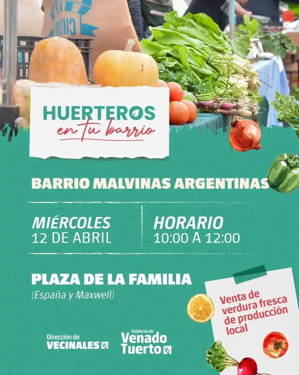 El programa “Huerteros en tu barrio” estará este miércoles 12 de abril, de 10 a 12, en la plaza de la Familia (España y Maxwell) de barrio Malvinas Argentinas, con su oferta de verdura fresca de producción local y a precios justos, bajo la organización de la Dirección de Vecinales.