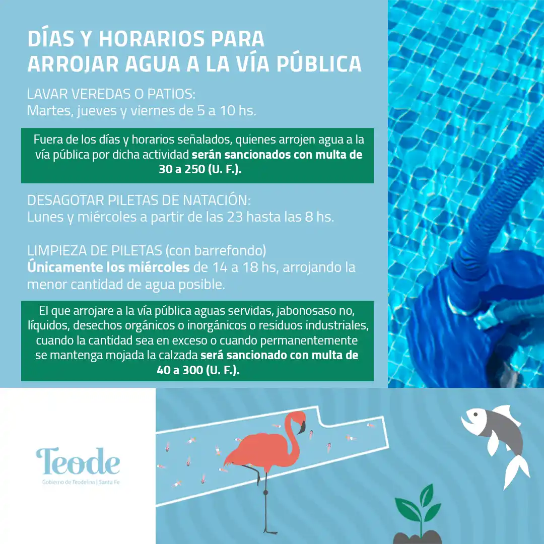 El área de Prensa y Difusión de la Comuna de Teodelina recuerda a la población que, para arrojar agua a la vía pública a los efectos de lavar veredas o patios, están habilitados los martes, jueves y viernes, de 5 a 10.