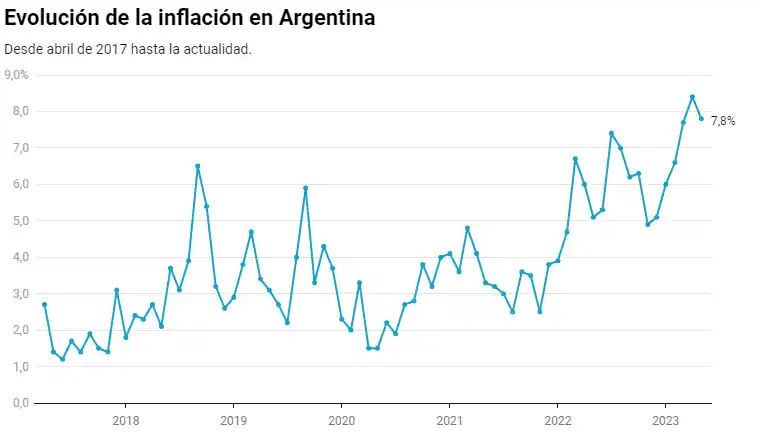 Los precios al consumidor (#IPC) aumentaron 7,8% en mayo de 2023 respecto de abril y 114,2% interanual. Acumularon un alza de 42,2% en los primeros cinco meses del año https://t.co/T6MhaPrAc8 pic.twitter.com/xto9xvl8cd— INDEC Argentina (@INDECArgentina) June 14, 2023