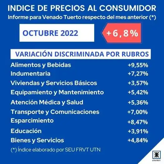 Antes de conocerce los datos de la inflación a nivel nacional de parte del Indec, el Centro de Estadísticas de la Facultad Regional Venado Tuerto de la Universidad Tecnológica Nacional difundió un nuevo relevamiento de precios, donde se estima que la inflación en Venado Tuerto durante el mes de octubre fue de 6,8%