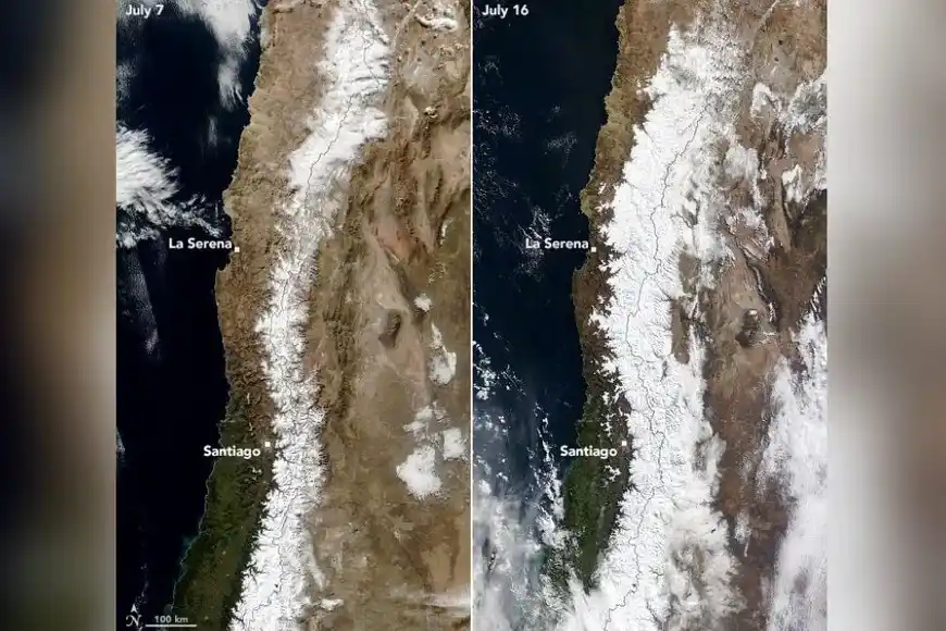 La Administración Nacional de Aeronáutica y el Espacio (NASA) compartió espectaculares imágenes que muestran a la cordillera nevada en su totalidad. Sin dudas lo que sorprende del paisaje níveo es que casi cubre por completo algunas regiones de Chile, lo cual es un fenómeno insólito en el país trasandino.