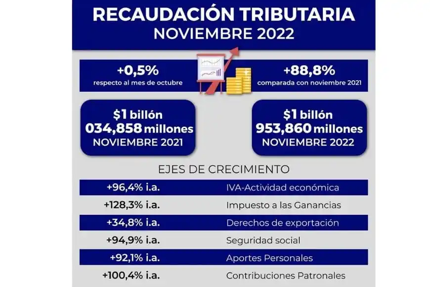 “Cuando resta un solo mes para finalizar 2022, la recaudación tributaria a noviembre acumula $17,68 billones, con una variación interanual de 79,9%” por lo que “los ingresos tributarios del año crecieron por encima de la variación general de precios”, destacaron desde el organismo.