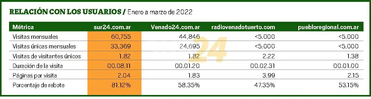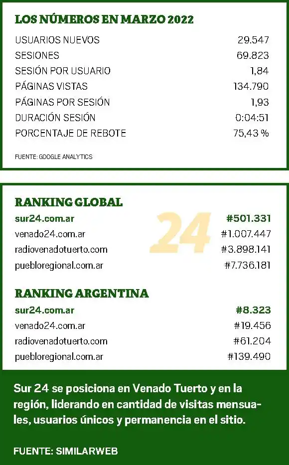 Es motivo de orgullo para nosotros: en marzo pasado, a un año de creado el sitio www.sur24.com.ar ya lidera claramente la mayoría de los marcadores en el extremo sur de la provincia, tanto en cantidad de visitas mensuales, de usuarios únicos y de permanencia en el sitio. Según datos que aportan tanto Google Analytics como SimilarWeb, el mes pasado hubo casi 40 mil usuarios (y, un dato muy importante, casi 30 mil usuarios nuevos); hubo casi 70 mil visitas al sitio y más de 134 mil páginas vistas. Pero, por ejemplo, en enero de este año, todos esos marcadores estuvieron arriba de esas cifras, por lo que es objetivo para este segundo año de vida mejorar todos esos guarismos, importantes de por sí para una web localizada y referenciada en un punto preciso del mapa.