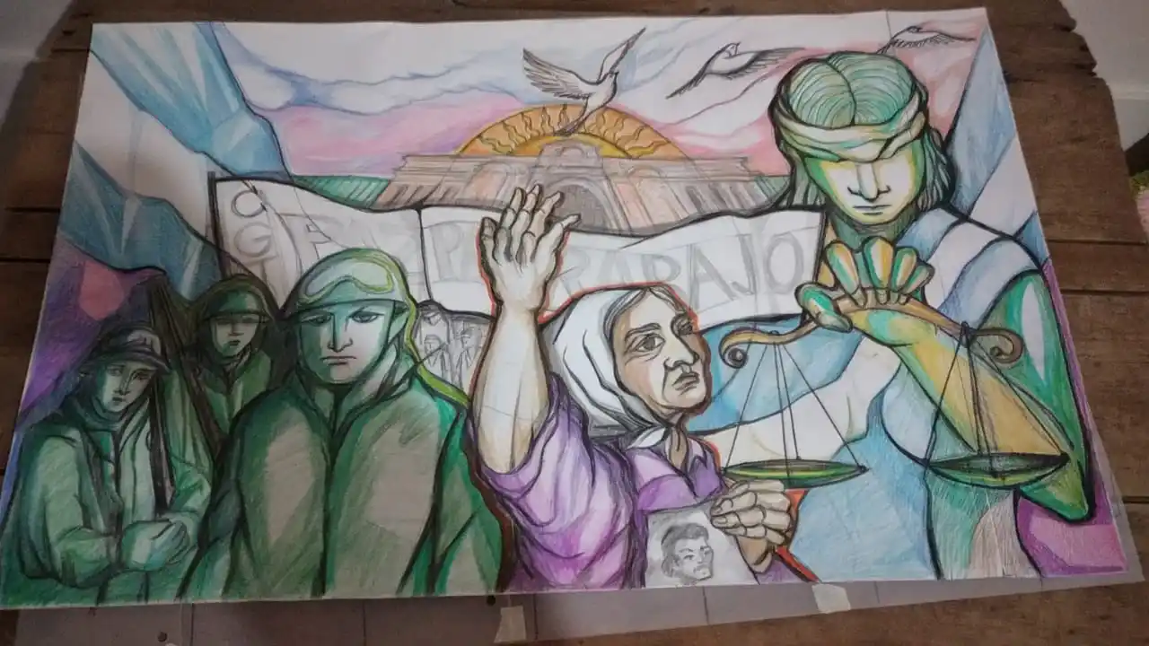 En diálogo con Sur24, la muralista reconoció su satisfacción por este nuevo logro en su amplia trayectoria y describió que “el boceto aprobado trata temas que abordan distintas circunstancias vividas en estos 40 años de democracia, como la Guerra de Malvinas -que desencadenó la caída de la dictadura- y también las luchas populares, la restauración de un gobierno democrático y la acción de la justicia”.