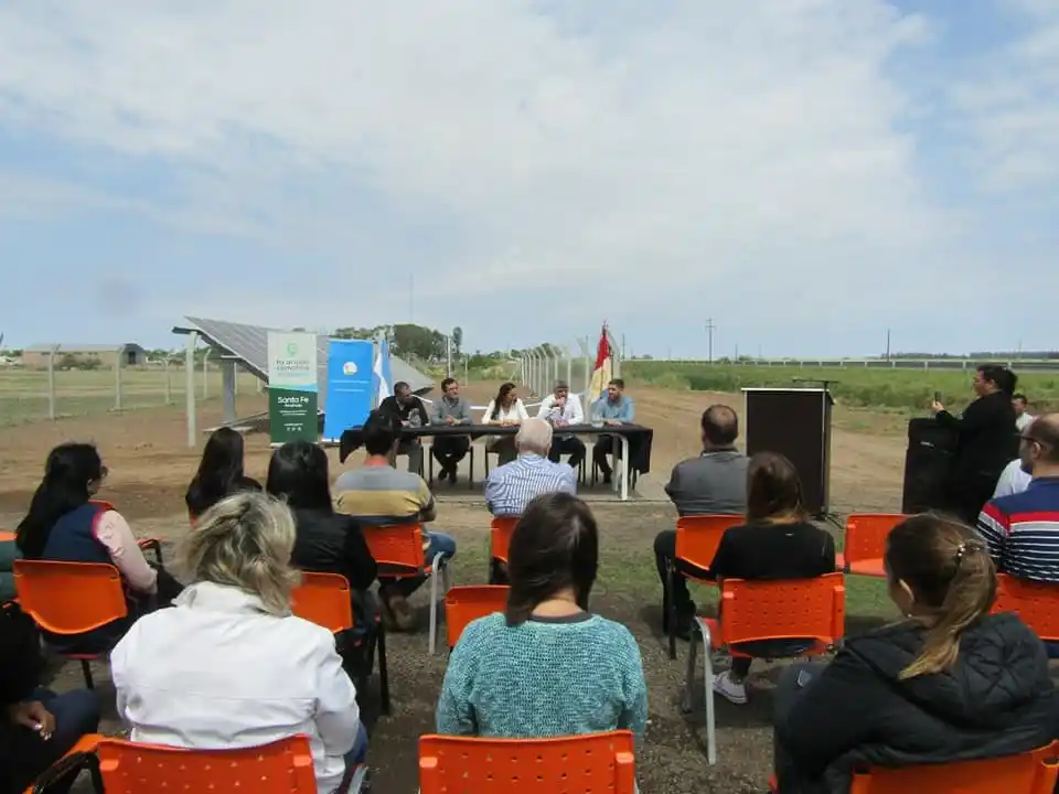El acto estuvo presidido por la ministra de Ambiente y Cambio Climático de la provincia, Erika Gonnet y por el presidente comunal, Gonzalo Goyechea, acompañados por el subsecretario de Tecnologías para la Sostenibilidad, Franco Blatter; el Vicedecano UTN Venado Tuerto, Jorge Amigo y el presidente de la Cooperativa de Servicios Públicos de María Teresa, Kevin Baker.