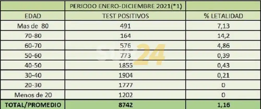 Otro de los datos importantes es que si bien en 2021 la cantidad de test positivos fue mayor a la de 2020 (5.520 en 2020 frente a 8.742 de 2021), el índice de letalidad fue mucho menor (1,16 en 2021 y 8,68 en 2020).