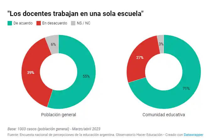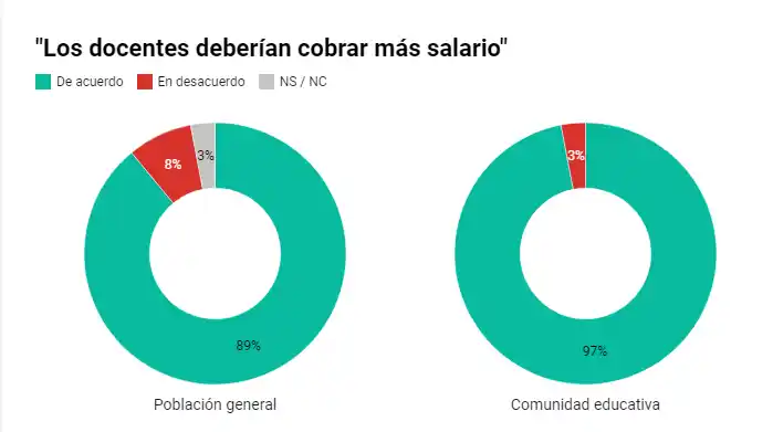 De ese estudio surge también 9 de cada 10 entrevistados consideran que los docentes deberían cobrar mejores salarios, a la vez que hay un acuerdo mayoritario (tanto de la población general como la comunidad educativa) para decirle adiós al “docente taxi”: los profesores deberían trabajar en una sola escuela y no tener múltiples lugares de enseñanza.