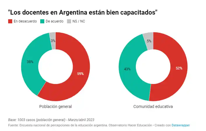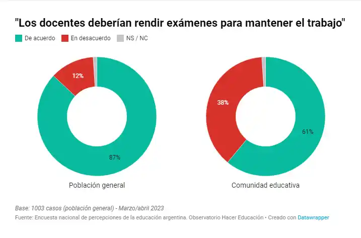 Entre los argentinos hay consenso en cuanto a que los docentes deberían tener mejores salarios y condiciones laborales, pero también reclaman mayores exigencias al sector del magisterio. Casi 9 de cada 10 argentinos (un 87%) opina que los docentes deberían ser evaluados anualmente para mantener el trabajo. En un menor porcentaje (61%), la comunidad educativa también comparte este diagnóstico. Esos datos surgen de una encuesta de percepción de la educación argentina que realizó el Observatorio Hacer Educación, que depende de la Universidad Nacional de Buenos Aires (UBA).