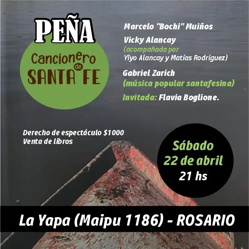 Los artistas venadenses Flavia Boglione y Gabriel Zarich han sido invitados a participar cantando en la noche inauguración de “Peña Cancionero de Santa Fe”. La cita es este sábado 22 de abril a las 21 en la ciudad de Rosario en la Pulpería LA YAPA (Maipú 1186), con la participación de Marcelo Muiños desde los textos y lectura de poesías junto a Vicky Alancay en la música y canto (acompañada por los músicos Juan Alancay en guitarra y Matías Rodríguez en percusión).