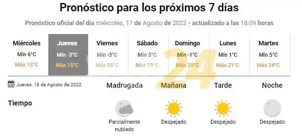 Agosto está trayendo variada actividad climática, con días soleados y temperaturas cálidas para disfrutar al aire libre, pero también vientos como los que se presentaron en el inicio de esta semana entre lunes, martes y este miércoles. En tanto, para este jueves, el Servicio Meteorológico Nacional pronostica que este 18 de agosto la mínima marcará -3ºC, lo mismo estima para el día viernes, con máximas que no superan los 20ºC.